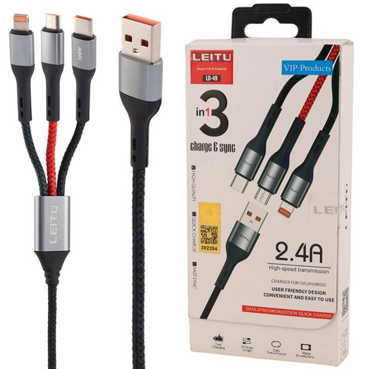 کابل 3 سر فست شارژ Leitu LD-49 2.4A 1m