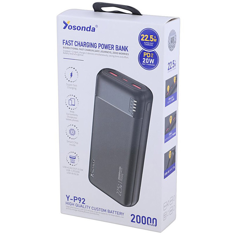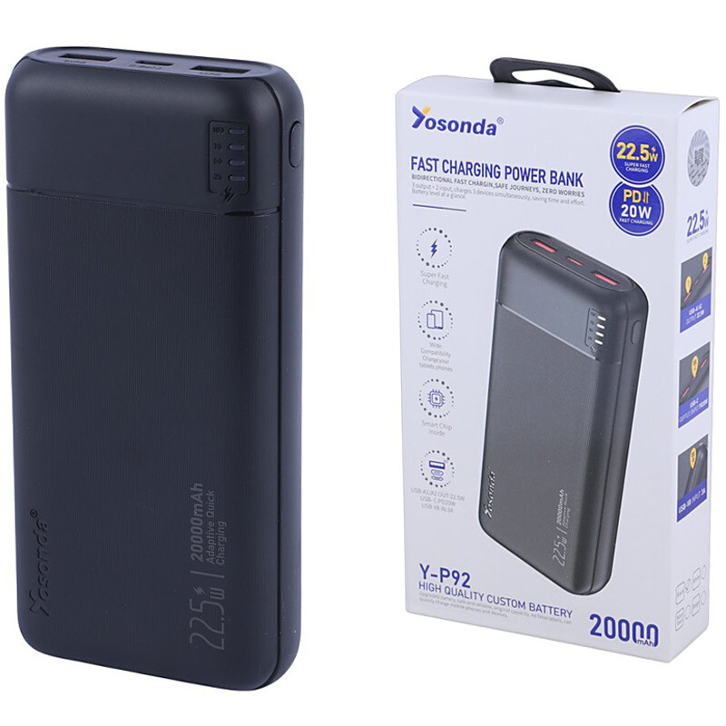 پاور بانک فست شارژ یوسوندا Y-P92 QC PD 22.5W ظرفیت 20000 میلی آمپر ساعت